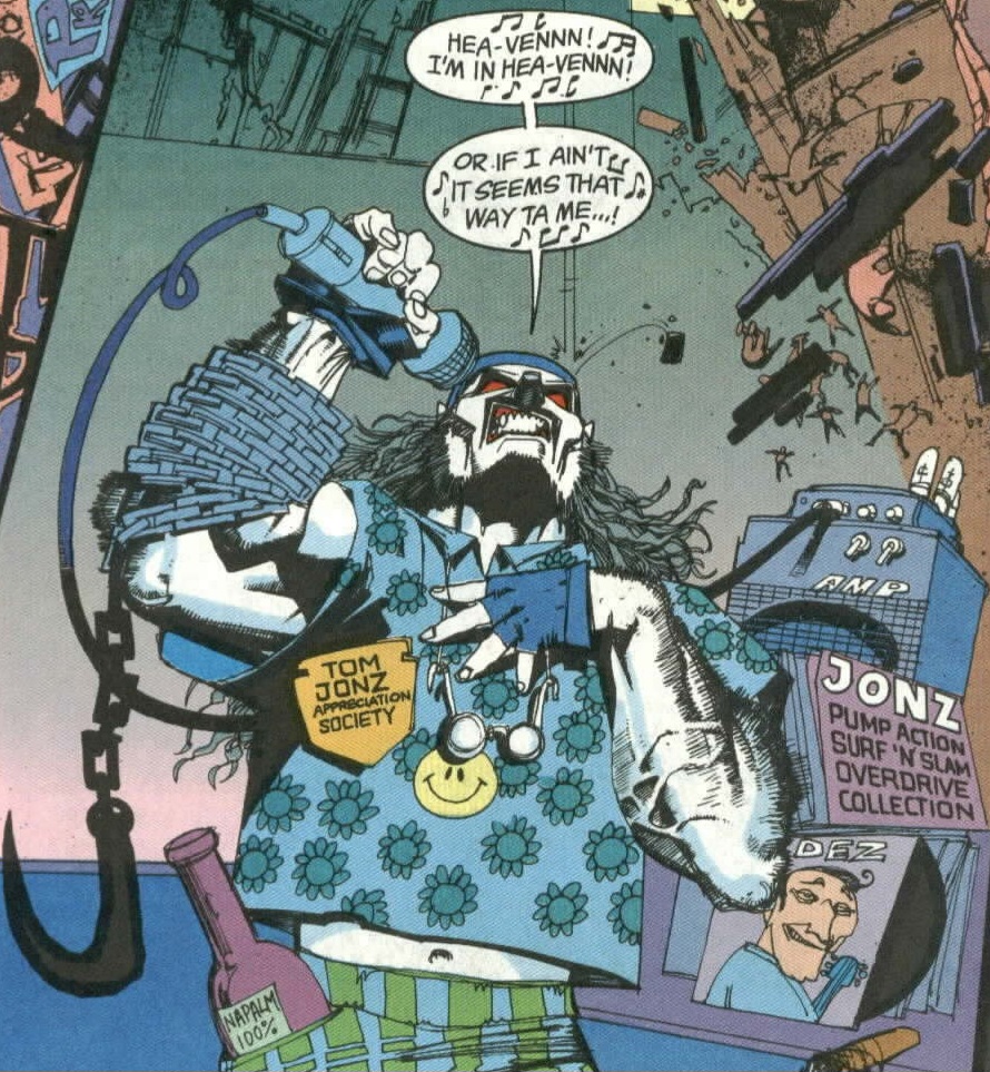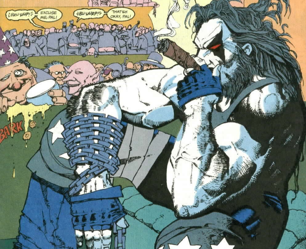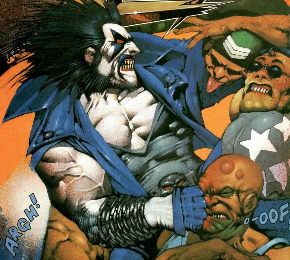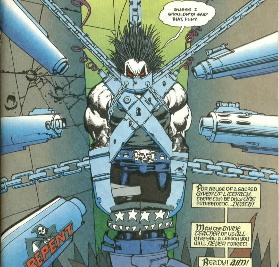 Feetal’s Gizz! We’re at the end of this miniseries already? Damn! Time sure flies when you’re writing about a sadistic, alien psychopath, huh? Yep. I remember my first experience with the Lobo character. My brother, SymbiEric, and I were opening up packs of DC Cosmic Cards in my mom’s car after eating out at our favorite restaurant, Giovanni’s Pizza. As we greedily looked through our now grease-covered, newly-acquired acquisitions, one of us came across the Main Man’s card. And after looking at that unique visage and reading the information on the back, I was totally hooked! Anyway, enough about me. It’s time once again for our “hero” to take center stage for the last time. Enjoy, Legions of the Unspoken!