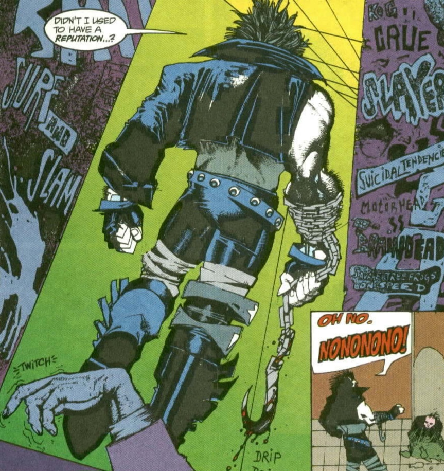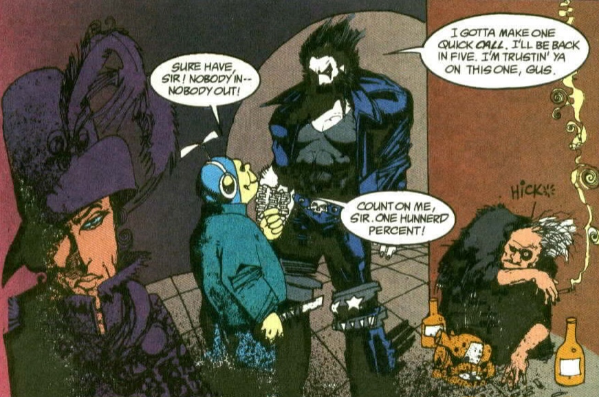 Lobo was finding his vacation time on Revel-7 to be a tad on the boring side. Where was the action? Where was the depravity? Where were the scantily-clad women? Sigh. This was definitely not what the Main Man signed on for. Miss Tribb overhead him complaining and scoffed. Maybe he’d be more comfortable with a destructive riot, some unprovoked murder, etc? Lobo grinned in response. He picked Tribb up under his arm and carried her over to a coat hook on the outside of the room’s closet door. He hung her there, suspended by her collar, and slammed the door to the room shut. He then went on his merry way in search of a communication device. (Man. Respect your elders, ‘Bo. At least iron her wrinkles out before hanging her up. Ha! Damn. This series is making me sick and twisted! I like it!)