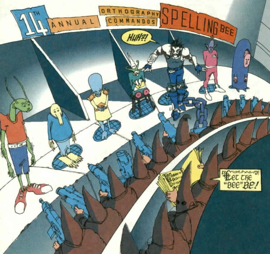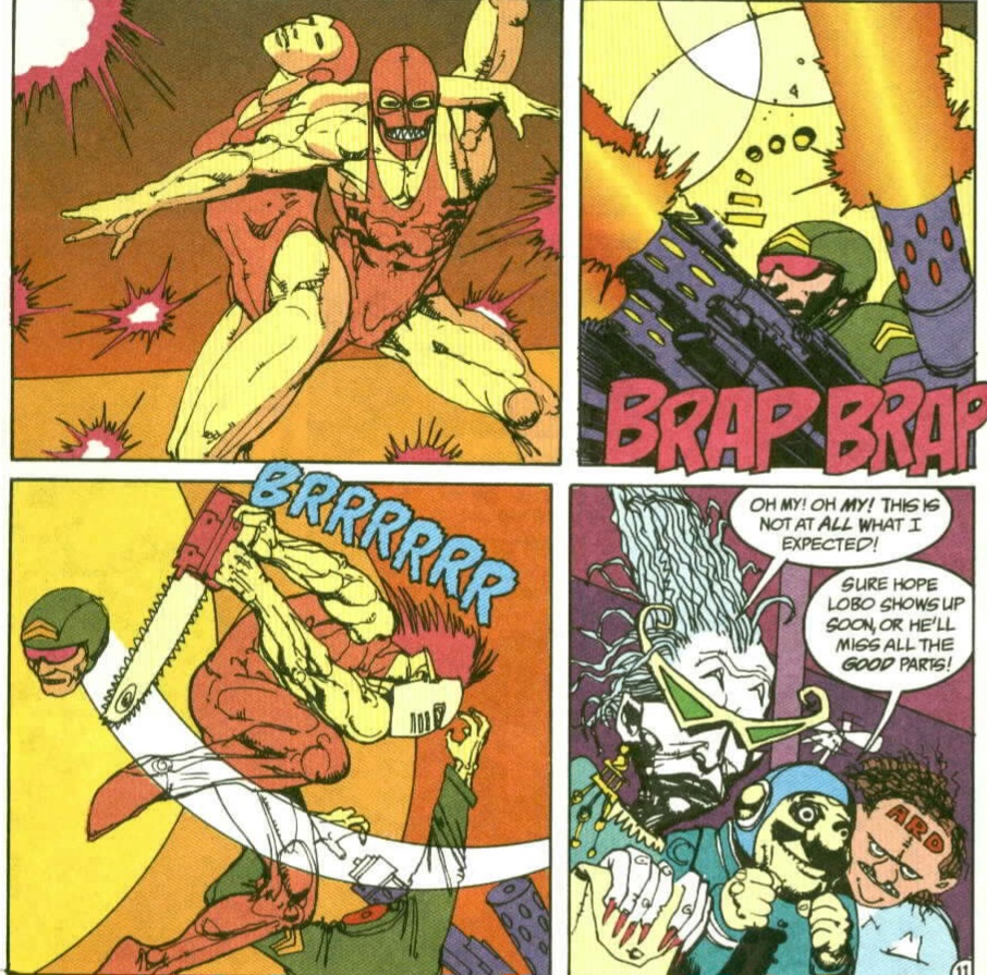 The grannies arrived planetside and saw all of the obscene peep shows and porn shops littering the surface! They now had a new mission in life! They opened fire on the buildings! This barrage destroyed the incoming fleet of the dance/theatre company! As more and more of Lobo’s enemies fell from the skies, he admired their explosive deaths, oblivious to who they were or that they were here for him in the first place! (Men! Am I right, ladies? On the sadder side of things…..all of that alien pornography…..lost forever. Sob. Shudder.) The Main Man rocketed past the carnage upon his space-hawg with his complaining passenger in back. Soon after, Vril Dox shut the door to his office and nearly jumped out of his green skin as he heard a gruff voice from behind. Turning, he saw Lobo and his legless captive. When questioned about her missing limbs, he merely replied that women were always losing one thing or another.