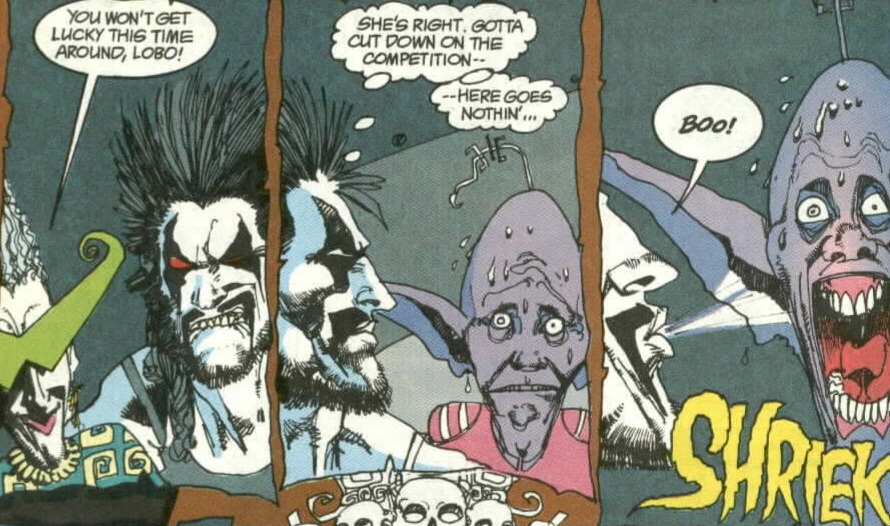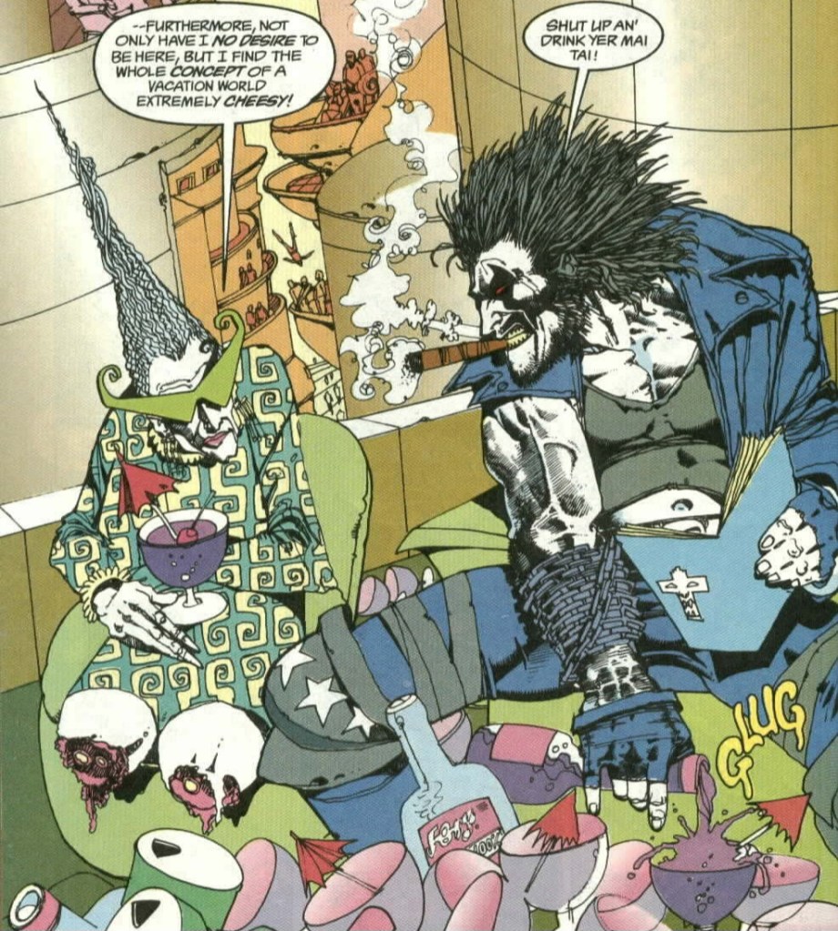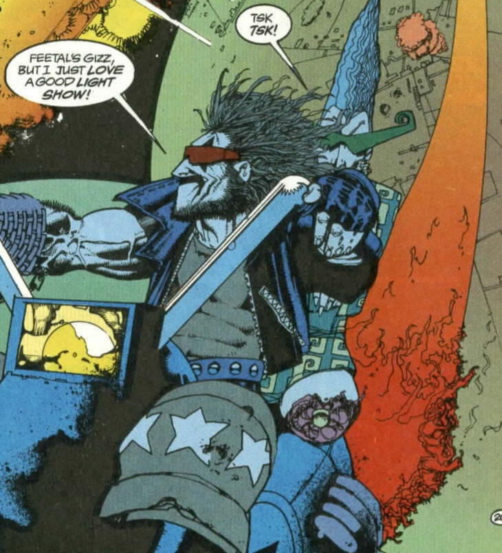 At L.E.G.I.O.N. headquarters, Vril Dox paced frantically and slammed his gloved fist into his office wall. How could his plans have gone so awry? Now five parties bent upon Lobo’s demise were about to converge upon a renowned vacation planet and it was all his fault! As he mentally went over his options, a L.E.G.I.O.N. operative knocked on the door. It seemed as if Lobo had hacked the Revel-7’s communications network for the entire planet! Vril switched on his viewing screen. Lobo quickly came into view. He stated his feelings of boredom and announced that the denizens of this world had five hours to evacuate before he began the massacre! The screen went as blank a Vril’s facial expression. Utter chaos erupted on Revel-7 as an entire population tried to evacuate the planet at once! Lobo sat back and enjoyed the show he’d created! (That’s…..friggin’…..awesome! The dude’s a dark genius I tells ya! Oh to only be in my early twenties again and to party with the Main Man. But middle age is just as cool…..sniffle…..)
