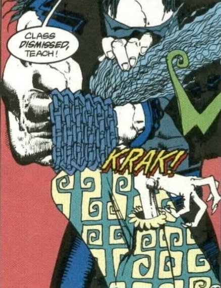 Lobo handed over the older Czarnian woman. Vril was then forced to admit that Lobo had done a good job. She did arrive alive after all. Mission accomplished. Satisfied with this, Lobo then marched over to Miss Tribb, took her head in his powerful arms, and snapped her neck! Dox looked at Lobo in shock! Lobo spoke in passing that no-one ever said she had to live after delivery! He laughed maniacally as he left the office. Vril Dox attempted to rub away the instant pain emanating from his temples. (Note: Only one teacher was harmed during the writing of this particular series of articles. )