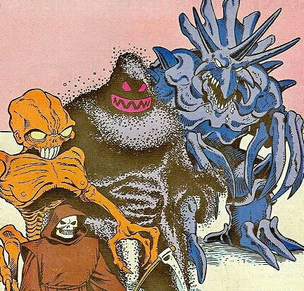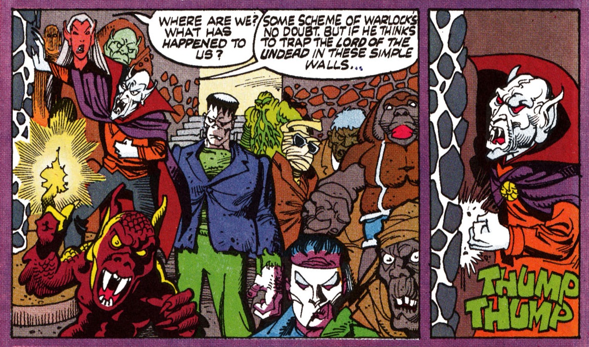 In a dark and faraway castle, two of the world’s greatest monsters clash in a titanic struggle! The Warlock catches his longtime foe, the Vampire, in a ring of arcane power! But the Vampire is one step ahead and escapes by transforming his body into mist! That’s when the two finally halt their fight. They’re just too evenly matched. The Vampire reasons that the Warlock would have the monsters of the world conquer humanity now, while he doesn’t think the time is ripe and to wait awhile longer. Warlock agrees with this. Vampire continues that perhaps, rather than continuing their endless struggle, each of them will amass the biggest groups of the world’s most terrifying creatures and the leader with the largest number of followers will win the contest and implement his plan unheeded. The Warlock agrees and the two alpha monsters take their leave to begin recruiting. (Yeah, I know. The Vampire is obviously Count Dracula with a baldness problem and who the hell knows what the Warlock’s real name is. Why are their monikers so bland, you ask? The answer is simple: Dracula was offended by being turned into a colorful toy and threatened to sue. What an ass!)