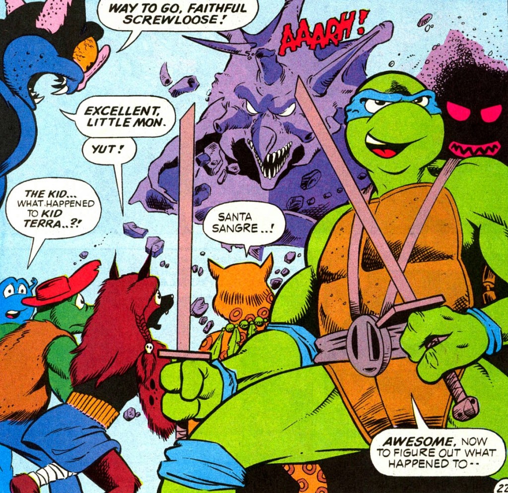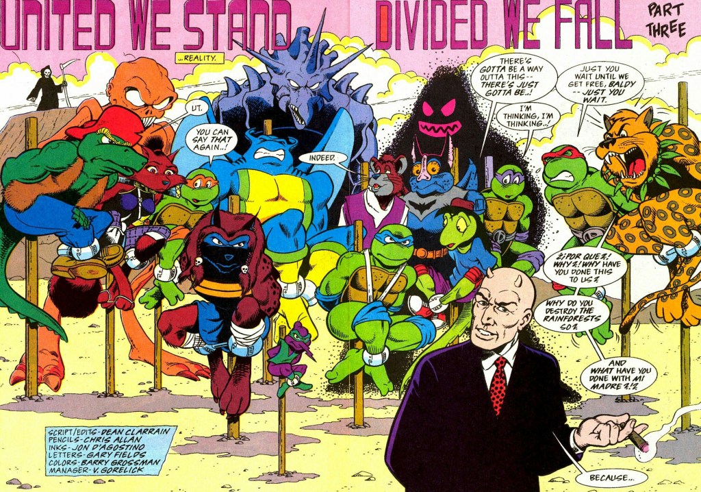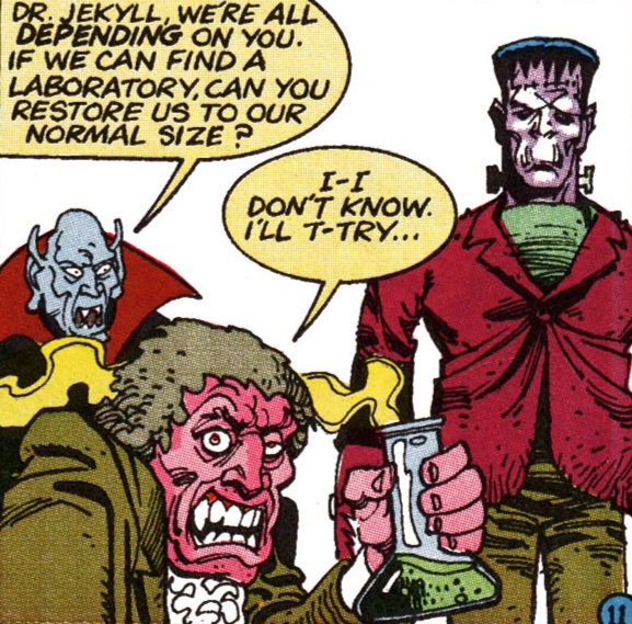 Back at Vampire’s camp, Werewolf howls in outrage that a mere house cat would threaten him! Against Vampire’s orders, he sprigs and attacks the feline! But alas, he’s knocked aside with a swift swipe from the cat’s clawed paw! The cat advances upon the fallen Werewolf! But the ground beneath it’s paws erupts with mud and sludge! Afraid the alley cat retreats! The Swamp Beast slowly emerges from the ground. They have all been saved from a grisly fate. Vampire decides that they need to escape to a safer place to think. Without warning, Frankenstein’s Monster throws the Mummy into the back of a parked pickup truck! He then motions for the others to climb the deceased Egyptian’s wrappings! They do so and plot as the titanic vehicle pulls away. Vampire asks if, should they discover a proper laboratory, Dr. Jekyll could perhaps reverse whatever has been done to them. Unsure, the doctor agrees to try. (A million New Kids on the Block advertisements later, we arrive at the next part of our tale. Sheesh!)