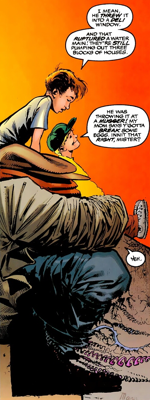 Later, after leaving the relative safety of the vehicle, the monsters round a fire hydrant the size of a large house. The Vampire is lost in thought by this time, worried for the fate of his monstrous companions. He pauses as the others walk on. He suddenly spies a woman’s ankle several times his size as a female pedestrian walks unknowingly overhead the Lord of the Undead! Unable to control his base instincts, he transforms into a miniscule bat and flies towards her exposed neck! As the others roar for him to stop, the Vampire bites down! Annoyed by this slight irritation, she smacks what she presumes to be a mosquito! The dazed Vampire plummets towards the sidewalk! Luckily, the Swamp Beast’s soft body breaks his fall! The monsters are covered with disgusting swamp muck as it flies everywhere! Still ravenous with hunger, Vampire runs after the woman, grabbing hold to one of her swiftly moving heels! The other monsters follow their leader, afraid for his very life! (Well, someone has a fetish! And for once, it’s not Quentin Tarantino! Ewww! But I digress. “Pulp Fiction” and “Reservoir Dogs” are the bomb, yo!)