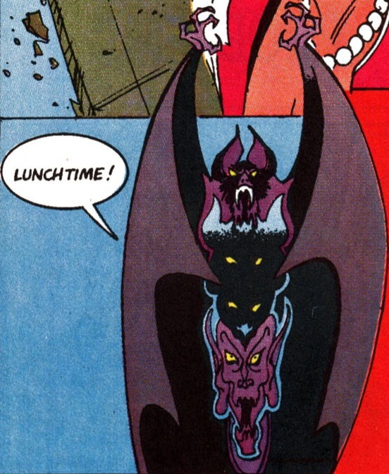 The Vampire’s group of monsters awaken in darkness. For those not blessed with night vision, a gremlin lights a match to illuminate their surroundings. They all appear to be trapped, surrounded by strong walls! Cursing the Warlock for his obvious treachery, the Vampire tries to break them free. Nothing. But when it comes to superior strength, the Frankenstein Monster is nearly unmatched. He easily punches a hole through their prison wall. Looking about, they’re all surprised to find that their “prison” was no more than an overturned cardboard box and that they are only mere inches tall! To make matters worse, a stray cat has just discovered what it presumes to be an easy meal! Meanwhile, the Warlock and his band of creatures are discovering that they are in the same situation but in a completely different location! The master of arcane magic is outraged that his vampiric adversary would sink low enough to shrink him and his beastly cohorts. (Awww! Aren’t they cute? Question: How has everyone been meeting Medusa’s cursed gaze without becoming no more than stone statues? Ah! The writer didn’t expect my level of nerdy attention to detail! Fool!)