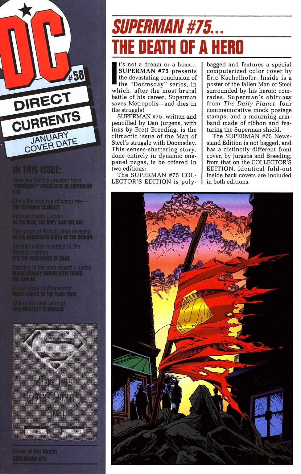 Hello Legions of the Unspoken! I’m very sorry for not being around much as of late; I’ve been busy with my Kansas City Royals winning the World Series and just life in general aside from that. I’ll have a full-length article or podcast up very soon, but in the meantime, here’s a look at the Direct Currents (DC’s house prozine of the late 80’s and 90’s) from January of 1993 that features a look at some Elseworlds stories, the underrated Scarlett, but most importantly, the Death ofSuperman! Enjoy and tell us what you think was most exciting about what DC was putting out in 1993!