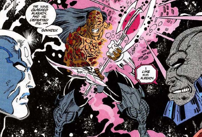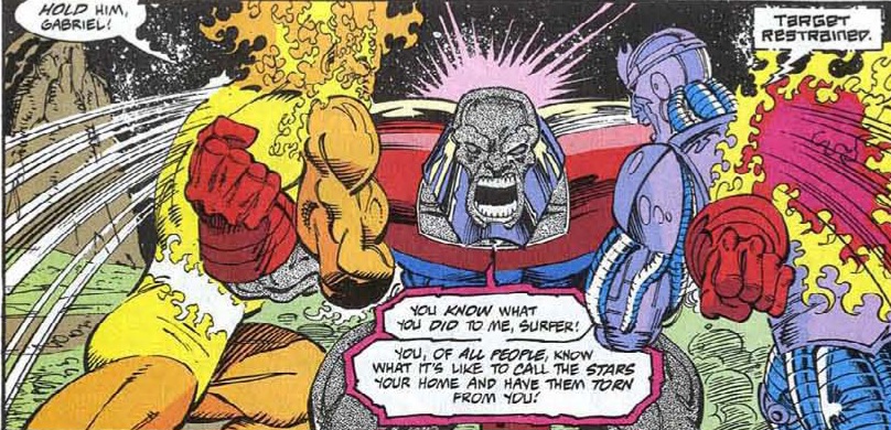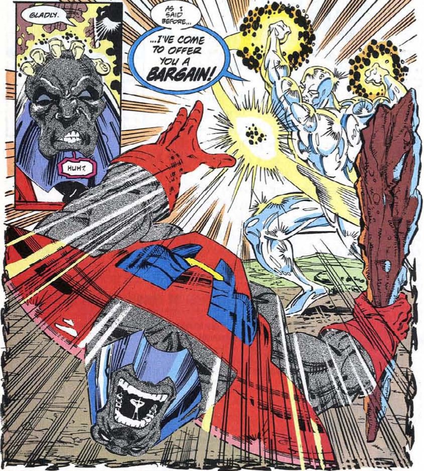 It is the year 1992 and lightning strikes ominously as the Minion cyborg suddenly appears in a grungy back alley in New York City. Energy crackles from his metallic form as he constructs a deadly weapon out of the liquid metal in his right arm by sheer will. The cyborg is now ready to continue its mission. It will kill and assimilate the mind of one Reed Richards of the Fantastic Four! At that exact moment, Mr. Richards sits in a fancy, French restaurant, awaiting the arrival of his lovely wife, Sue. He looks up as the waiter appears with a phone. Mr. Fantastic takes it with a small thank you and answers. It’s Sue. It seems that she’ll be late for the date as she’s currently being held up at a charity event. He replies for her to take her time as he hangs up, amused. For once, she’s the late party. (For those of you that don’t know, Reed’s a crappy husband. He’d rather invent new technologies than satisfy his wife’s needs. Now, the sexy, aquatic monarch, Namor, wants Sue for his very own. So, emotionally cold but genius husband, or kingly and powerful bad boy. Let’s take a vote. Come on, ladies!)