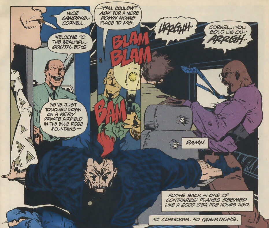 One of the men asks if the pilot can be trusted. Jared replies that he trusts him completely. He owes him one. Just then, the subject of their conversation enters the cabin and opens fire on all three of them! The criminals drop, riddled with holes! But Jared dives to find cover! The pilot promises that he wasn’t paid to take Stevens out. If he surrenders, he won’t be harmed. Positive that this is a blatant lie, Jared pulls a knife from his boot and throws it at the traitor’s hand! It hits home and the pilot drops the gun! That’s when one of the others uses his last breath to fling a grenade at their attacker! (A grenade?! Who carries a grenade onto a plane in case of emergencies? A man that thinks ahead, that’s who!) The plane quickly explodes into flames, hurling Jared Stevens through burning shrapnel and the night sky beyond! He crashes down in a forested area, apparently uninjured!
