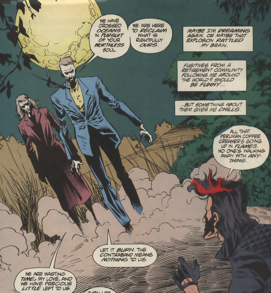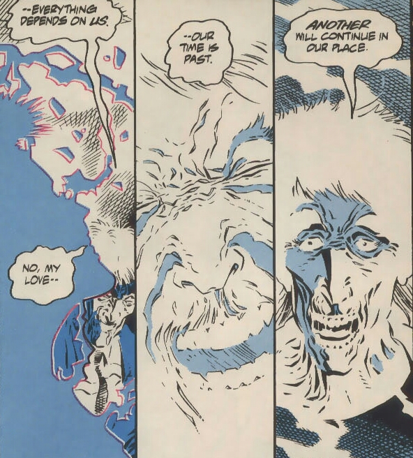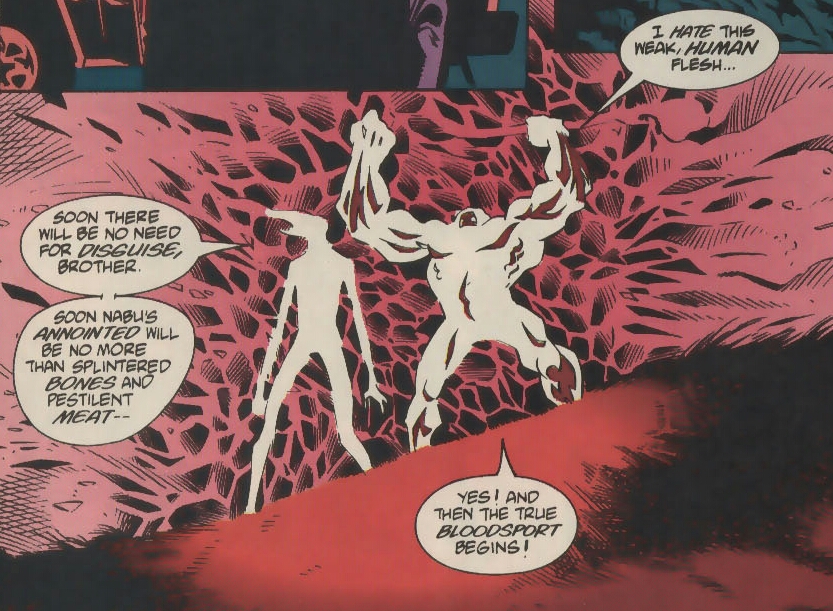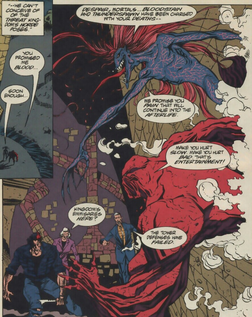 Jared Stevens crawls from the rubble, clutching his utterly ruined arm in anguish. He hears sounds of what must be an epic battle being fought nearby. He curiously investigates. A large humanoid is fighting a man dressed in crimson, his arm wrapped in golden ribbons. He also brandishes a large golden blade. He hears the man call the large being Kingdom. It appears as though this Kingdom is winning. As the man falls, he utters through his pain that though Kingdom has defeated Dr. Fate, he will not fall so easily! That’s when Jared spies this hero’s face…..it’s his own! (Surprise! What? You knew?! Look, just because this comic originally came out in 1994 doesn’t mean that you have the right to be a smarta$$!) Jared awakens. He clears the strange vision from his head and wraps his damaged arm in the mystical cloak. He then grabs Dr. Fate’s helmet and leaves this disastrous scene behind him. He needs time to process all that has transpired and hide from any demons that might still be nearby.