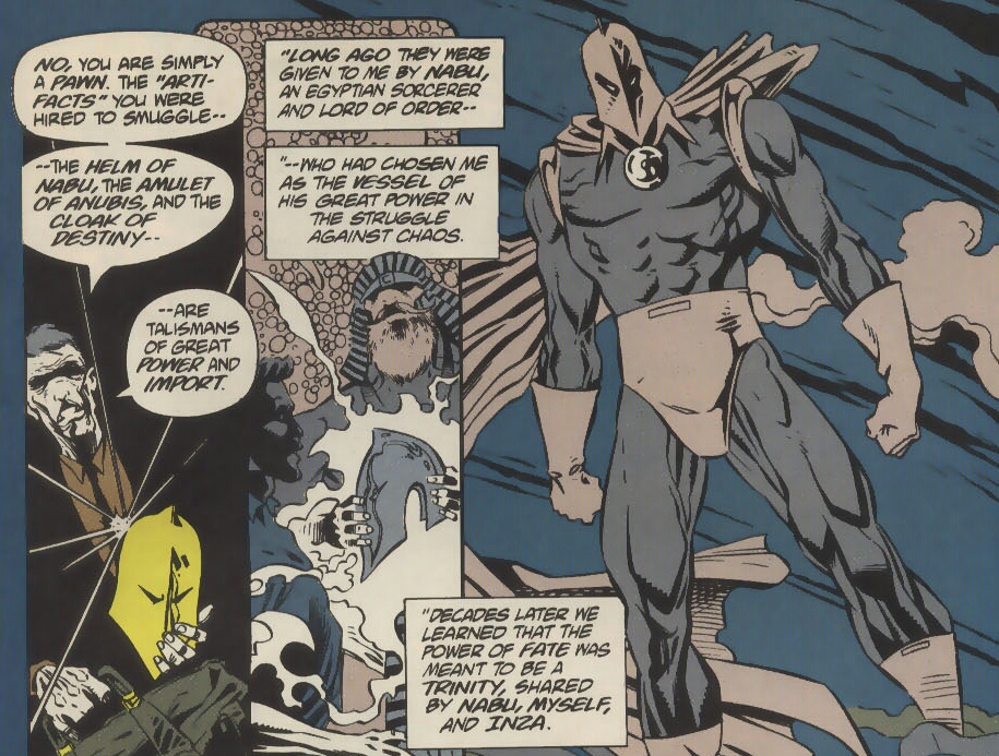 Jared Stevens shakes his head as he tries to regain consciousness. He sees that he is bound by rope and seated in some type of stone room without windows. The elderly couple stands before him. The man speaks. They are known as Kent and Inza Nelson. He states that the items that Jared has in his possession are none other than the helmet, cloak, and amulet of the mystical avenger known as Dr. Fate! He continues that he and his wife used to be merged into one being and that combined, they were in fact this hero! (Can you imagine merging bodies with your significant other? Ugh! The chick flicks you’d have to endure!) It seems that a recent event involving time separated and aged them, casting the artifacts back to the place of their origin, Egypt. That’s where Jared found them and took them, seconds before the rightful owners were to reclaim the powerful artifacts.