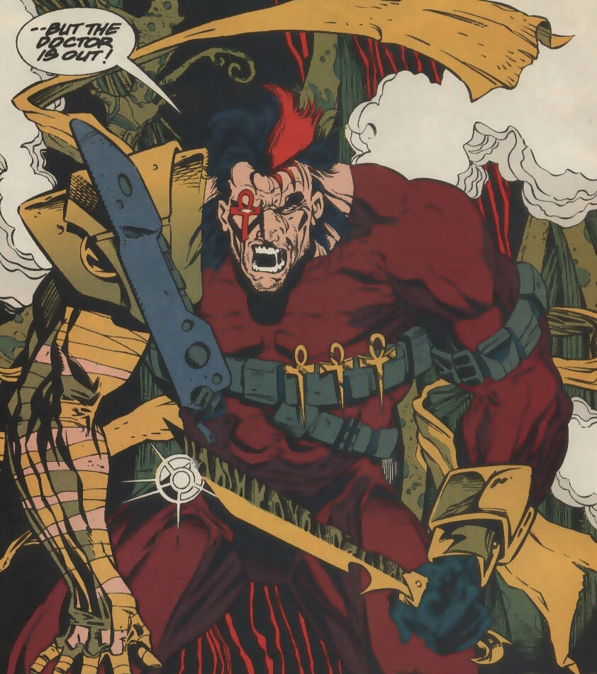 Later, Jared Stevens’ ex-wife, Holly, returns home. Noticing signs of a break-in, she grabs a butcher knife and slowly looks around. The man sitting in the darkness of her living room speaks, scaring her half to death. Then, fright becomes anger as she recognizes the voice. Assuming that her ex-husband is once again in hiding from some illegal activity gone wrong, she demands that he leave immediately. That’s when he takes her by the shoulders with shaky hands and says that he needs to hide somewhere safe and collect himself after all that’s transpired. She then sees him fully as he steps out into the light. A long, red ankh completely covers the right side of his face! Little does she or he know it, but a hero was born this night! It was fate.
