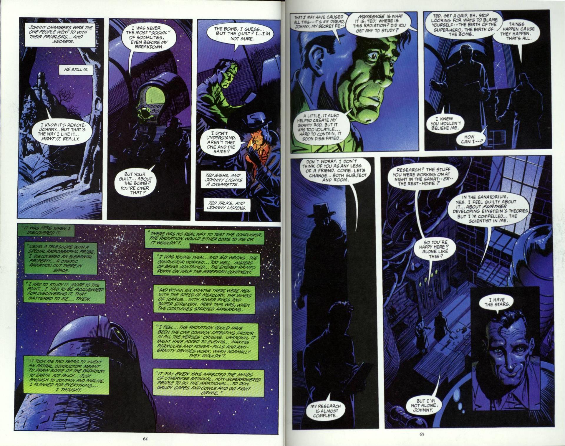 Starman’s descent into madness appears to have quelled some, also making sense. As someone of above average intelligence who deals with some mental roadblocks of his own in regards to anxiety and the like, I have my good days and bad days, but after a period of thought, I usually come to terms with whatever fears and mood I am dealing with. Starman is a genius beyond the genius level, and therefore, he is able to do the same. Of course, I feel guilty about a lot of things, but exposing the world to an energy that gave folks super powers and gave those without superpowers who fought crime under masks the inclination to do so isn’t one of them. Johnny Chambers listens on as Starman pours his heart out.