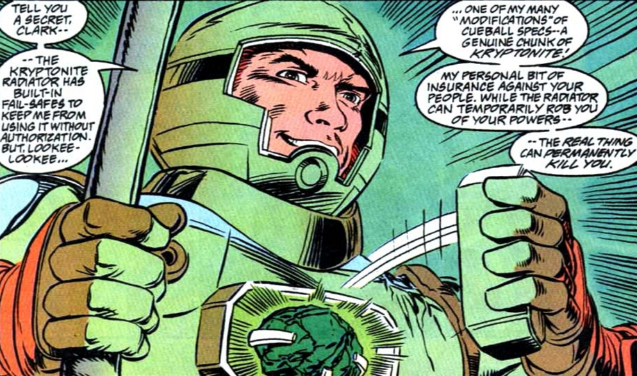 Lex explained that the Kryptonian race, though arrogant, didn’t deserve to die. Kal could teach them a better way. Tired of Luthor’s numerous head games, Superman grabbed him up by his armor and smashed him through several floors of the building! He demanded that Lex fix the panel. Luthor’s reply was a blast of green energy from a cavity within the armor’s chest! As he stood up, he grabbed an large iron bar. He explained that Jor-El had equipped him with a weapon powered by a small rock called Kryptonite. He then finished by gleefully striking the hero again and again with the weapon! Kal stirred to rise, but Lex revealed a large chunk of rock within his armor! It seems that Luthor wasn’t content to simply subdue Superman, he was going to kill him! But as he raised the bar for a final strike, he was shot from behind! Lois Lane stood with a smoking energy rifle! (Now she’s on Superman’s side?! Anyone have a scorecard I can look over?)