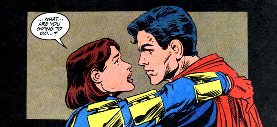 The captain removes their helmet revealing a woman underneath. She not only doesn’t thank Superman, but states how his Kryptonian aid is not needed. Human beings will win their own planet back. And they’ll do it without the help of one of their oppressors. Her name is Lois Lane. She orders the others to retun to base. As they leave, Superman suddenly takes her into his powerful arms and rockets into the sky! Once they’re alone, her tone of voice changes drastically . She tells him how much she has grown to care for him since he saved her life a mere couple of months ago. Superman hold her tighter as he descends into an apartment building window. They kiss passionately as he carries her towards her bed. (The next part of this scene is rated “R” for graphic, off-panel sexual situations.)