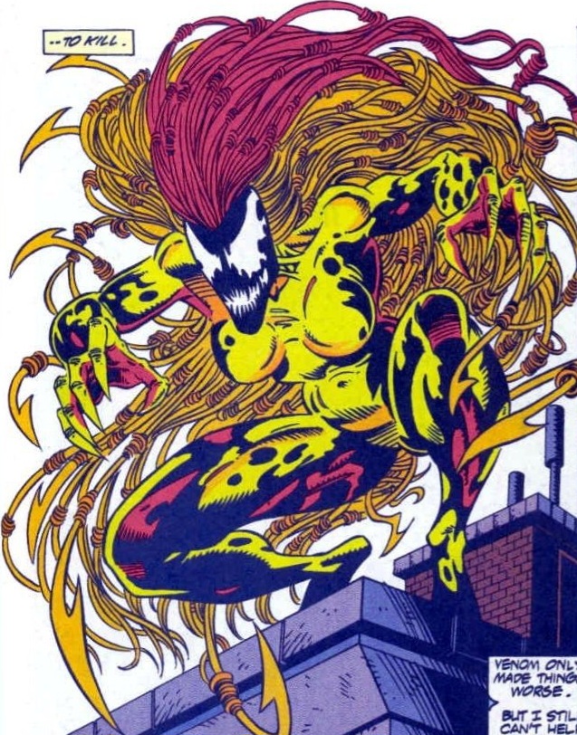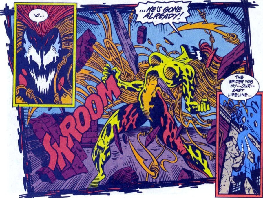 Venom doesn’t stay down for long though! As the Scarlet Spider swings towards his foe, Venom has already shot up a webline of their own, swiping at the hero with razor-sharp claws! Ben barely dodges! He’ll have to slow the villain down. He raises his web-shooter and fires countless orbs that explode upon impact into quick growing webbing! Soon, the symbiotic duo are completely encased, not unlike a deranged mummy! The hero attempts to take a breath and rest his open wound. He needs to plan. But an enraged Venom bursts through the several layers of ultra-strong webbing with an unearthly roar! Wasting no time, Venom pounces at Ben like a panther, sending them both over the building’s edge! (Damn, I nearly spit out my popcorn as I read the exciting words I just wrote! Damn, I’m good!)