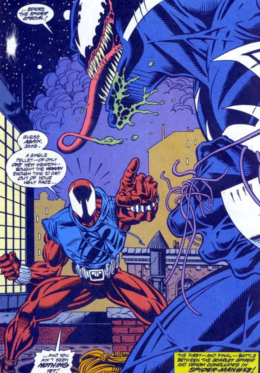 Well, here we are! The epic finale in the slugfest between the fledgling hero, now known as the Scarlet Spider, and the veteran villain, Venom! Will Ben Reilly succeed where so many other heroes have failed? Will he defeat the Lethal Protector once and for all? (And will I finish this article in or out of the bathroom due to stomach issues? Stay tuned!)