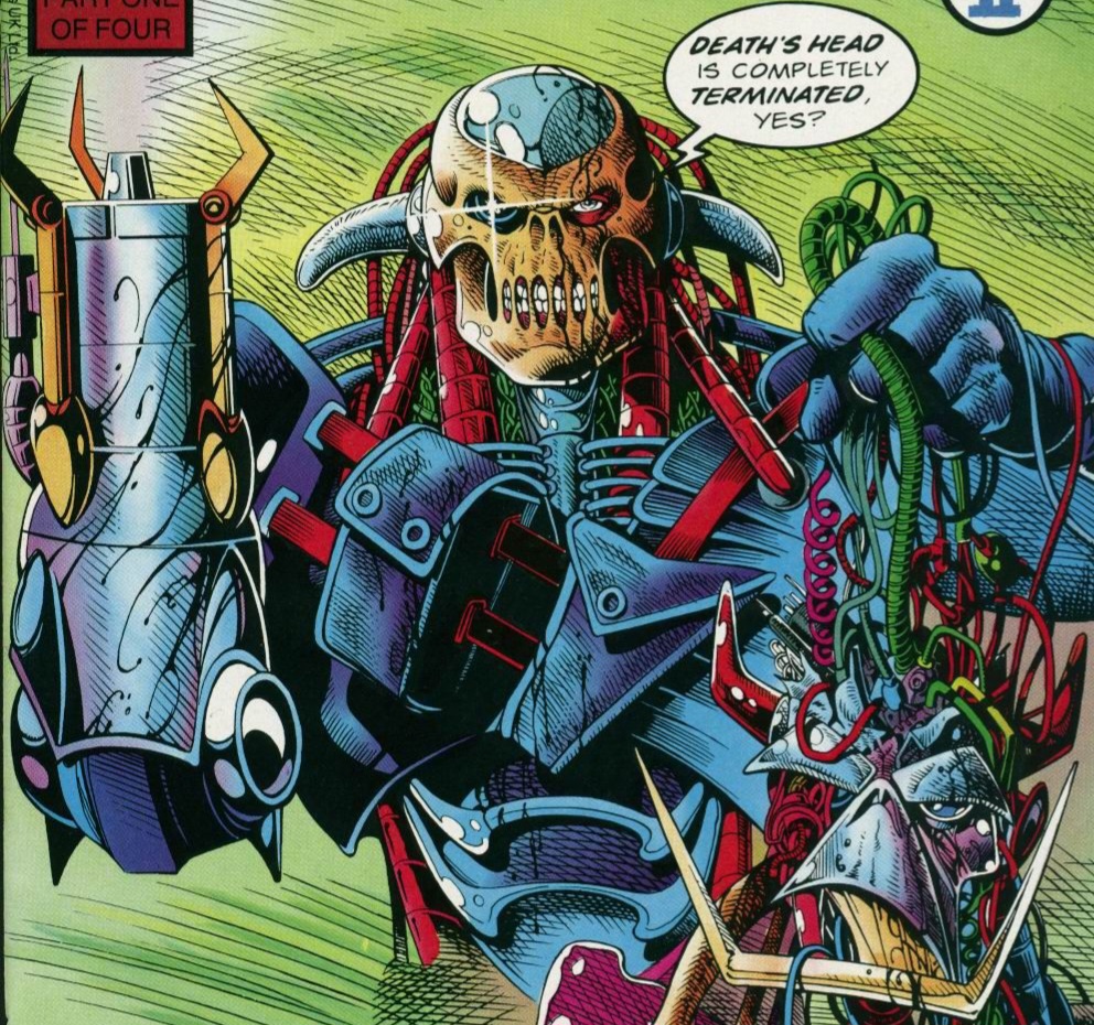 The robotic bountyhunter, Death’s Head, looked at his surroundings. He was now on a planet called Tyler’s World, within a supposedly impenetrable high-tech base. His target was a male by the name of of Tyler Wilson. Tyler had done well for himself, the hunter mused. This was his planet after all. (I’d get a planet named in tribute to me, but Ultra Sexy World was trademarked already. Damn you, Carrot Top! Always one step ahead of me.) Death’s Head spied a duo of highly armed mercenaries not far from his position. To his dismay, they put up little fight even when they noticed him bearing down on them. Way too easy. Or was it? Several more soldiers surrounded him, attacking fiercely! The robot used his hand-blade to send all of them to their makers and with little effort. Death’s Head did love his work. Three million credits to dispose of someone he wanted to kill anyway? A no-brainer. But as the bountyhunter entered the next room, he finally saw something he wasn’t prepared for. Tyler was strung up in a web of cables! Looming over him was a cyborg that’s tech put his own body to shame! Death’s Head called out for the cyborg to cease it’s attack. This was his prey. Ignoring him, it plunged blades from a weapon/arm into Tyler’s skull! It then stated aloud Tyler’s full name, the number one hundred and three, and that he was now assimilated! Ignoring this, Death’s Head demanded satisfaction for stealing his target! The cyborg looked to him and replied that he had other places to be, but he’d see the bountyhunter again soon. It then teleported away. Death’s Head handled the tracking device in his metallic hand. Sooner than the cyborg thought.