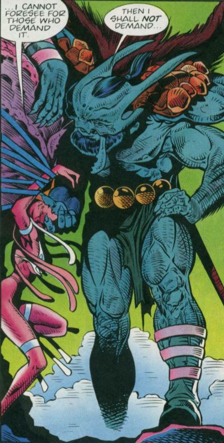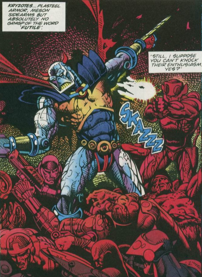 It was now the year 2456. The place was the Zeta Reticula quadrant. A rather large, barbarian-like being with a greenish, incectoid hide was demanding knowledge of his future from a bound, pink-skinned female creature! She refused and this was met with a fierce backhand from the monstrous creature! That’s when a robotic voice from behind the two answered for her. His future was to be murdered within minutes at the hands of the Minion cyborg! Minion leapt from his hiding place and attacked immediately! It caused an avalanche of rock with a blast from it’s cannon-arm and turned to the female. And then, it surprisingly freed her. To repay him, she hastily warned him that the alien barbarian wasn’t dead quite yet! And sure enough, he did crawl from underneath the rubble and spring at Minion! A backhand tore half of the flesh from the cyborg’s face and sent him reeling! (Always with the backhand! Anyone else think that this dude’s a space pimp in his spare time? ) But Minion wasn’t beat yet, growing a liquid metal spike in place of his cannon-arm, the cyborg first cut off the beast’s hand! He then followed by impaling him through the chest and then through the mouth! Minion stated that subject one hundred and four was now assimilated. But before he left this desolate scene, the female thanked him. Strangely enough though, she called him Death’s Head! Speaking of Death’s Head, he teleported in seconds later, narrowly missing all of this. But he had a lock on Minion now!