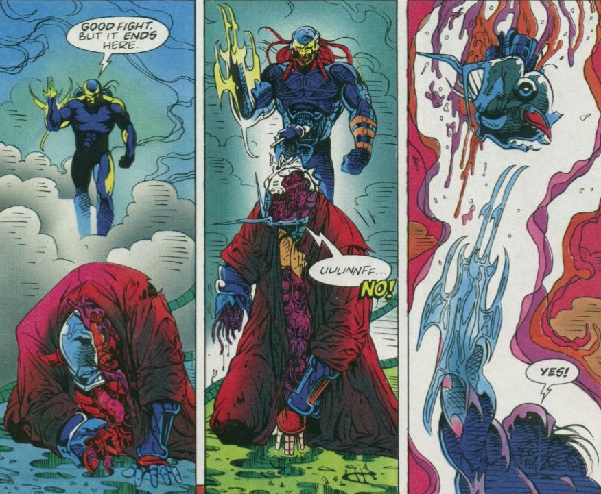 Minion arrived back in the year 2020 with Dr. Necker demanding to check his systems thoroughly. He declined. This angered the good A.I.M. scientist who attempted to order the cyborg into compliance. This verbal fight was interrupted however as Death’s Head crashed through the overhead window! He immediately fired a lazer rifle at Minion’s face as he roared in his hollow-sounding voice about his stolen bounty! As Minion slowly arose, he told the robot to not resist. Confounded, the bountyhunter asked if he was serious. Minion then leapt at him, saying that Death’s Head was in fact his next target! The two tumbled to the ground with a heavy thud! Minion tried to gut Death’s Head with his bladed arm, but the bountyhunter was too fast and used his own blade to impale the cyborg! But Minion did connect next, nearly tearing half of the robot’s head off in one powerful swipe! Minion approached from the rear as Death’s Head tried to recover. Too late. The rest of his head was cut cleanly from his metal neck! Minion wasted no time in absorbing the robot’s skills and traits. That’s when he started to overload! His circuits were on fire! And then, he suddenly stopped. Minion looked to Dr. Necker and told her he was now leaving for his next target. But he spoke as Death’s spoke now, using his expressions! He then teleported away, without another word! Necker turned to a nearby technician and demanded to know the identity of the next name on the cyborg’s hit list. The man replied that he had gone to 1992 to murder Mr. Fantastic of the Fantastic Four! (Was anyone else reminded of Rock em’ Sock em’ Robots during the fight? To the exxxxtreme!)