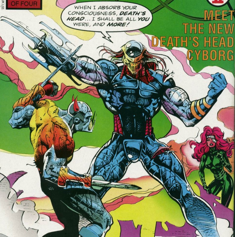 The cyborg arrived within an A.I.M. (Advanced Idea Mechanics) lab in the year 2020. His creator, a redheaded woman by the name of Dr. Evelyn Necker, asked for a status report from the creature. Called Minion, it answered with sarcasm that wasn’t part of her project’s original programming. She was annoyed by this but supposed it was inevitable as the cyborg absorbed parts of it’s targets’ personalities and skills that it found useful to itself. The lab technicians checked Minion out in every way possible, and it prepared to teleport away once again, eager for it’s next kill. Necker did manage to get the name “Death’s Head” from Minion before it disappeared. This mere mention of the robotic bountyhunter caused fear in the usually cold and indifferent doctor for some reason. Dr. Necker called for an emergency meeting of the A.I.M. board of directors immediately. She stated for all of those holographically assembled that she was concerned for the Minion project’s wellbeing as it was growing less and less controllable with every kill and that she required more funding to discover any bugs as this cyborg was created to ensure that A.I.M wasn’t somehow destroyed in the near future. It was to be their ultimate protector. Begrudgingly, the board agreed. (Man, she’s good. I could’ve used her to beg for a higher allowance from my ex-wife. Umm…..I mean…..never mind…..)